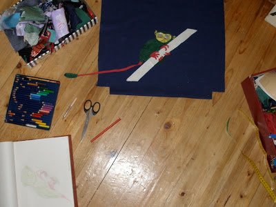 Aber neben Bürokratie und meiner hauptberuflichen Tätigkeit (dass die einem aber auch immer so viel Zeit raubt...) war ich auch kreativ. Ich habe am Banner für mein Dawanda Shop gearbeitet (und mich auch erst mal eingearbeitet ins Bildbearbeitungsprogramm), und ich habe genäht. Erst eine Hose von einem Freund mit den Resten des Kaffeeleinens geflickt, dann Hochzeitsgeschenke, und danach habe ich drei Beutel für meinen Shop genäht. Das Ausdenken der Applikationen dauert immer am längsten, macht aber auch am meisten